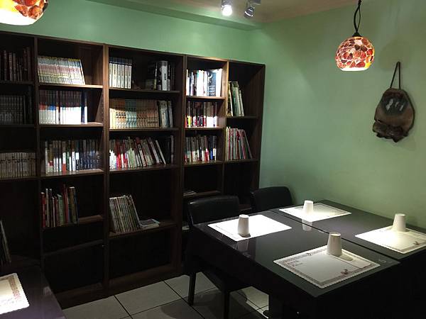 設計一排的書櫃, 擺了滿滿的書, 搭配較昏暗的燈光設計, 給人一種在自家書房看書喝咖啡的自在感~