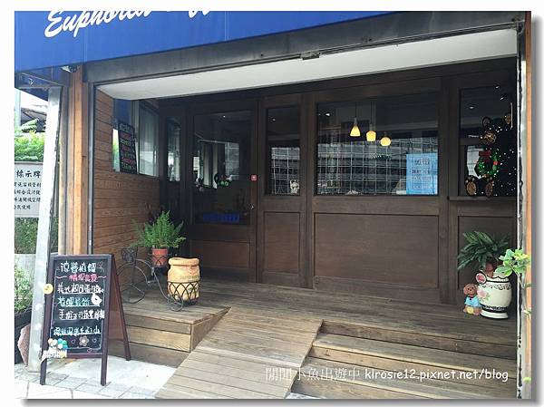 深藍色的頂棚, 木製大門跟牆板, 一些花園擺飾點綴其間, 試圖營造出一種日式雜貨風格~