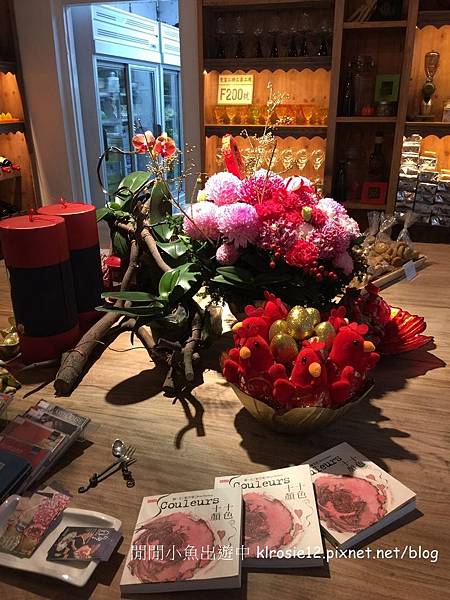 桌上喜氣插花跟雞年應景擺飾, 旁邊散置幾本書…